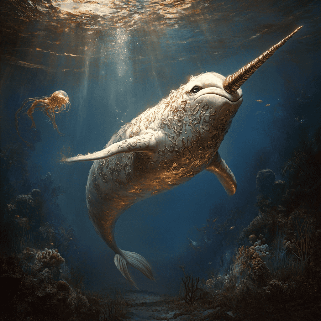 In this mystical realm, the Sea Spirits reigned, beings imbued with ancient wisdom and grace, bonded to the ocean’s every tide. Their guardian was Narlówyn, the Mystical Narwhal, a creature so remarkable that tales of her beauty spread in whispers across the sea. Her spiraled tusk, a radiant horn of pure magic, marked the delicate line between our world and the celestial beyond. Her presence was a gift, radiant and mysterious, mesmerizing anyone who dared approach.